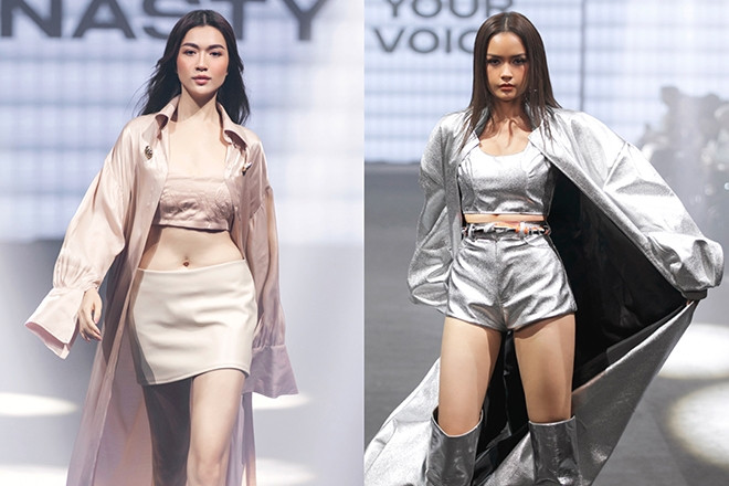 Hoa hậu Ngọc Châu, Á hậu Lệ Hằng mặc áo choàng quét đất catwalkHoa hậu Ngọc Châu, Á hậu Lệ Hằng cùng khoe eo thon, chân dài trong những thiết kế áo crop-top, chân váy ngắn và khoác áo choàng quét đất khi diễn thời trang.