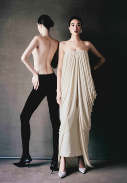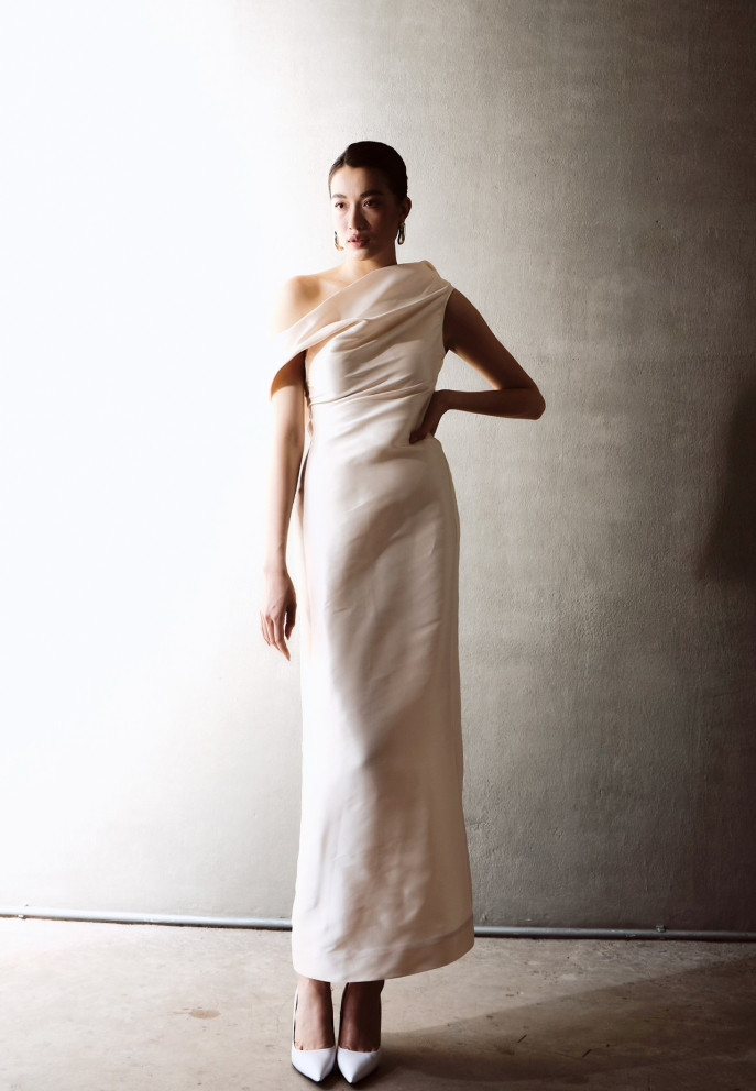 Nhà mốt Việt hướng đến sự tối giản nhưng khai thác trọn vẹn đường cong cơ thể, đồng thời ưu tiên chất liệu bền vững, không gây kích ứng da như: lụa dệt nguồn gốc Việt Nam, organza, crepe, taffeta, cotton…