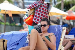 Người phụ nữ ngoại quốc thuê dù trên bãi ngồi đọc sách. Xung quanh có nhiều người nằm trên ghế để ngủ nghỉ.