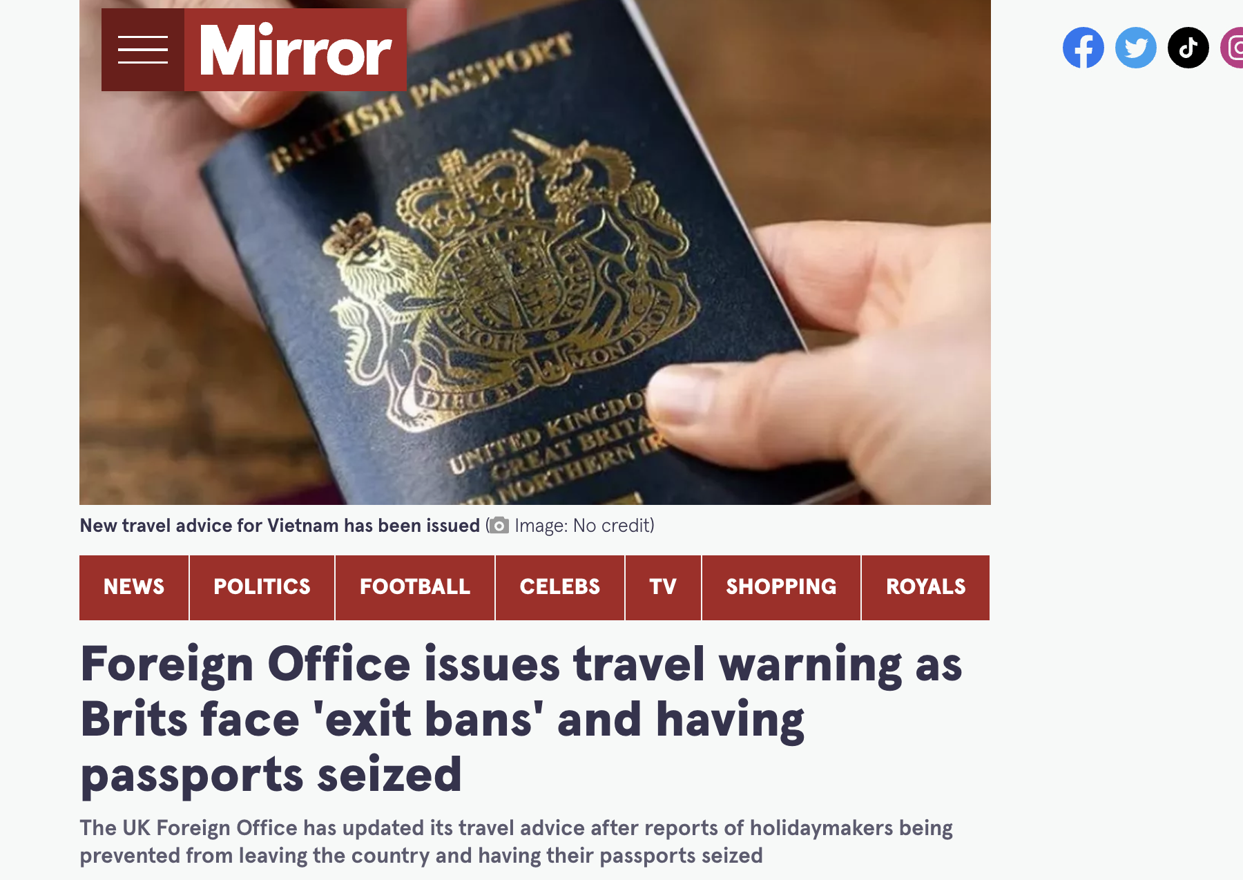 Một bản tin của The Mirror hôm 16 Tháng Tám dẫn nguồn Văn Phòng Đối Ngoại (The UK Foreign Office), tức Bộ Ngoại Giao Anh Quốc, nhấn mạnh: “Chính quyền Việt Nam có thể áp dụng lệnh cấm xuất cảnh đối với một số cá nhân để ngăn họ rời khỏi nước này. Sổ thông hành của bạn sẽ bị tịch thu cho đến khi vụ việc được điều tra đầy đủ.”