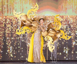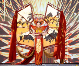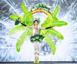 Hoa hậu Thế giới Việt Nam 2019 Lương Thuỳ Linh sải bước với thiết kế Khảm xà cừ, lấy cảm hứng từ nghề thủ công truyền thống cùng tên. Bộ trang phục truyền tải giá trị văn hoá, tài năng các nghệ nhân dân gian Việt.