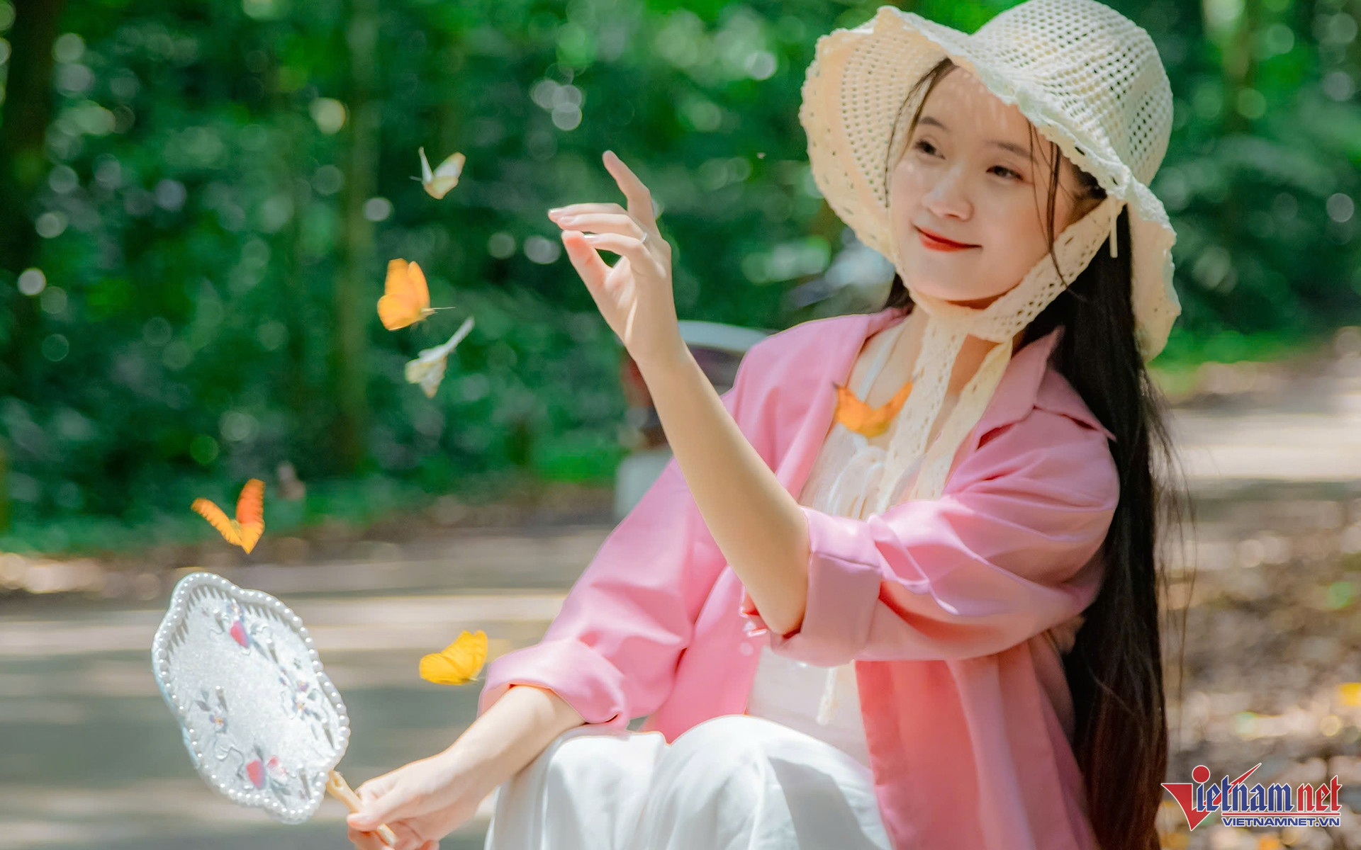 Bướm dập dìu bay thành từng đàn như những cánh hoa lơ lửng trong không gian, rồi đậu vào tay du khách.