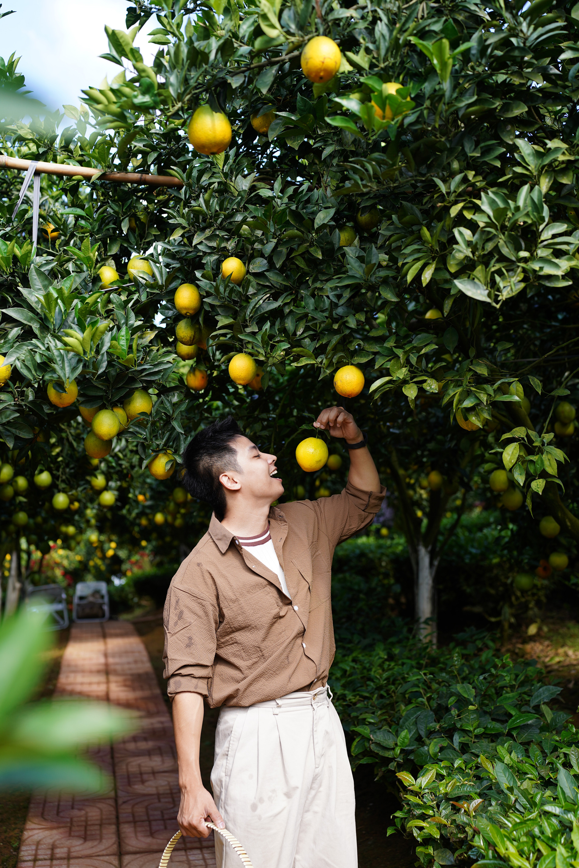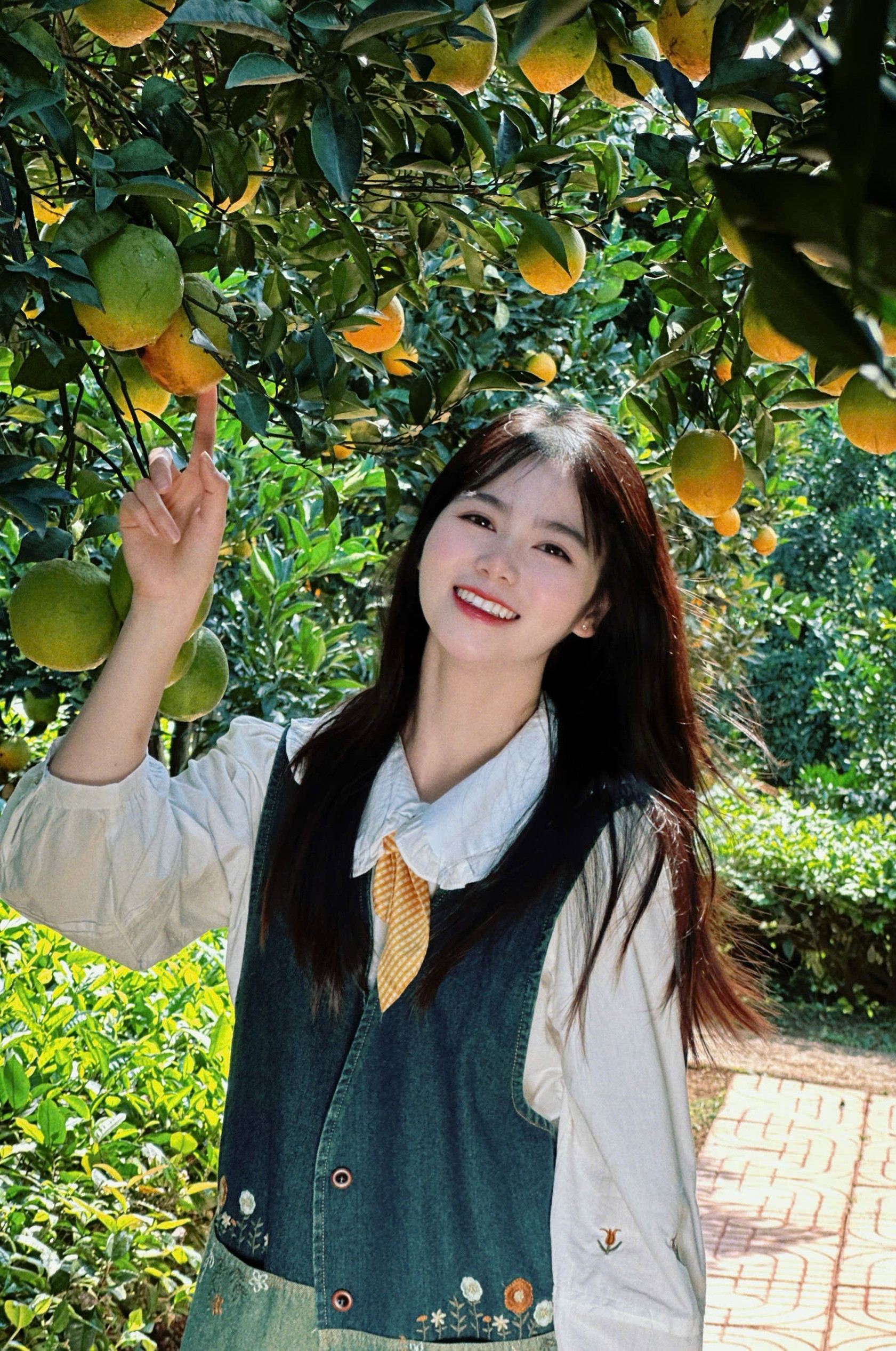 Bên cạnh đó, cây cam rốn lồi chỉ thấp ngang người nên du khách đứng ở góc nào trong vườn cũng có thể check-in, ghi lại những bức ảnh tuyệt đẹp.