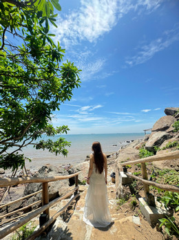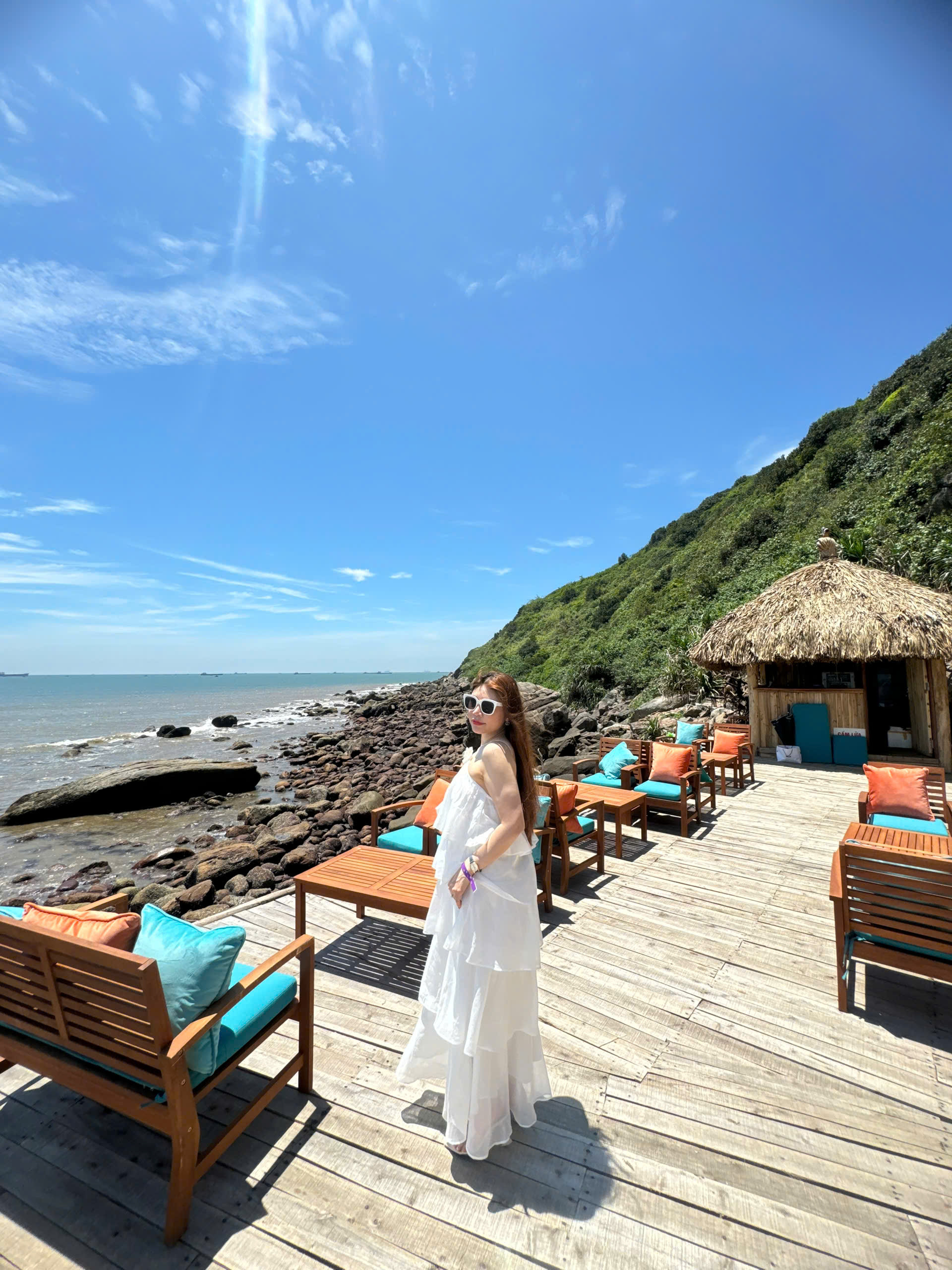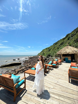 Đi bộ dọc theo cây cầu, du khách thấy có nhiều điểm ngắm cảnh biển ở bãi Đông ấn tượng và check-in đẹp mắt. Dọc theo cây cầu còn có những quầy bán đồ uống được xây dựng từ gỗ, tre, lợp mái lá.