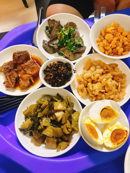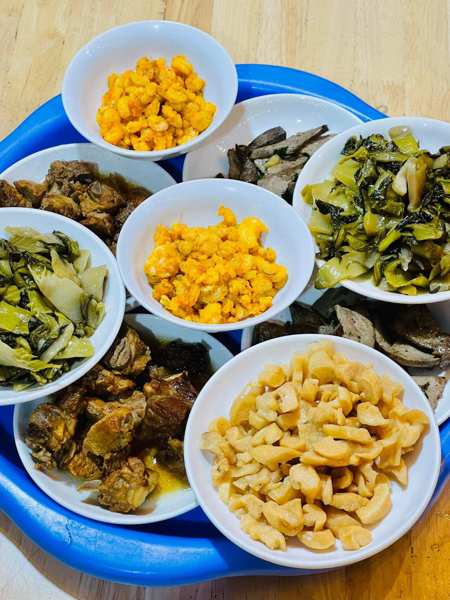 Ngoài những món quen thuộc như dưa nén xào, củ cải muối, tôm rim, tàu xì, cá vược kho, bò kho…, chị còn nấu thêm sườn rim, gan xào, cá mặn, trứng muối, trứng bắc thảo, cá phèn rán, thịt băm.
