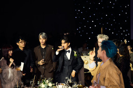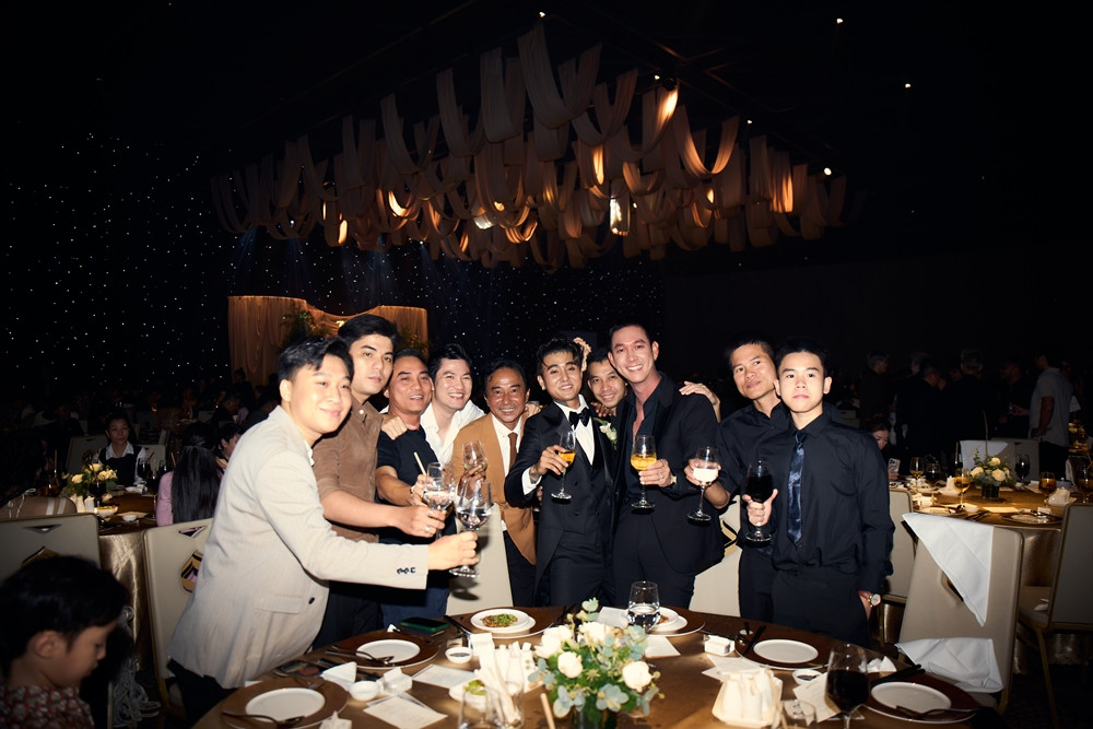 Bên cạnh các nghệ sĩ nữ, dàn sao nam cũng có mặt đông đủ để chúc mừng Đạt G và Cindy Lư. Quốc Trường xuất hiện bảnh bao trong bộ vest lịch lãm, thể hiện sự trân trọng với đám cưới của đồng nghiệp. Trung Quân, Hoàng Tôn, Châu Đăng Khoa cũng thu hút sự chú ý của các khách mời và truyền thông đưa tin tiệc cưới
