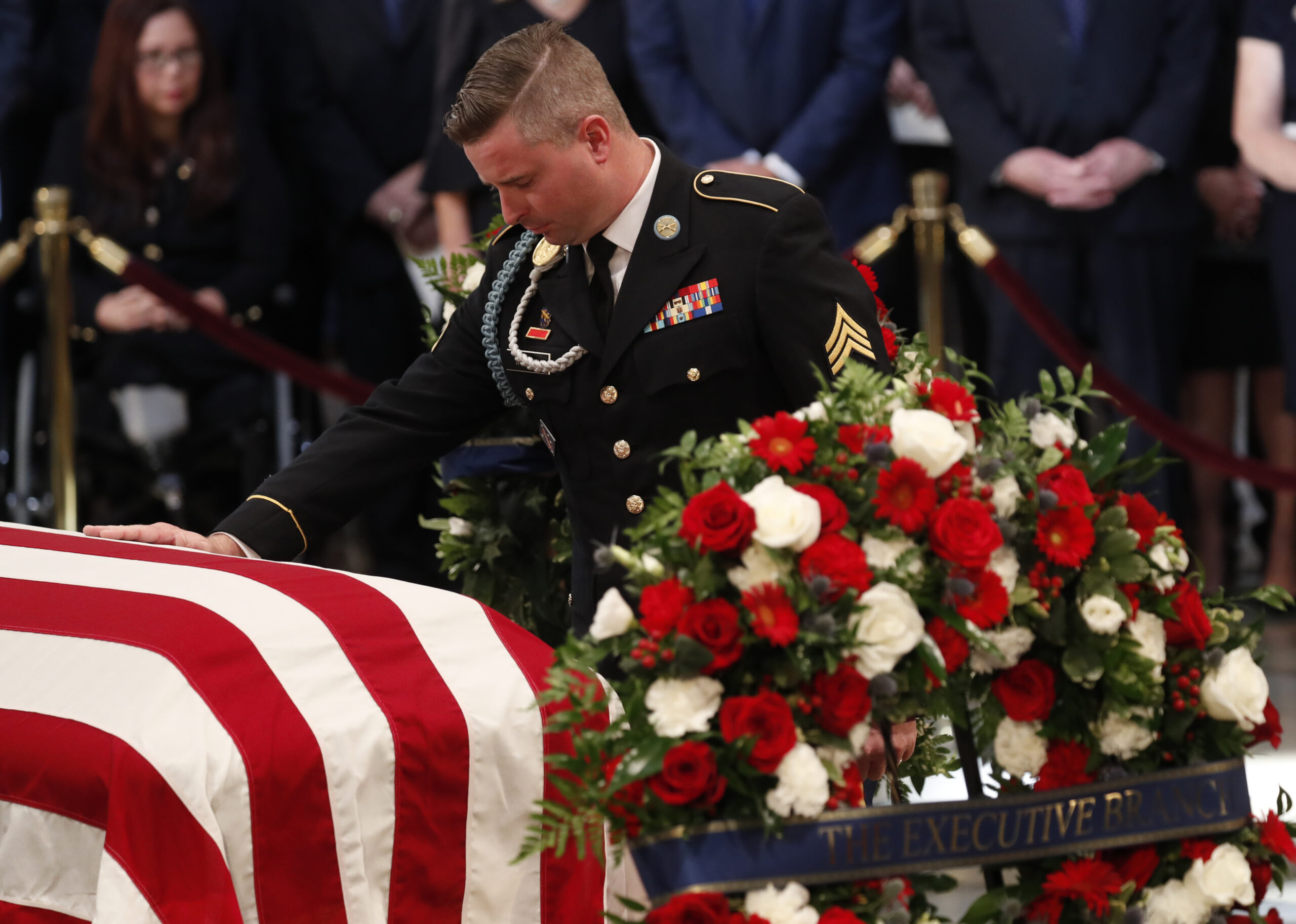 Ông Jimmy McCain chạm tay vào quan tài cha cha của ông đặt tại Quốc Hội ở Washington, DC, hôm 31 Tháng Tám, 2018. (Hình minh họa: Kevin Lamarque-Pool/Getty Images)
