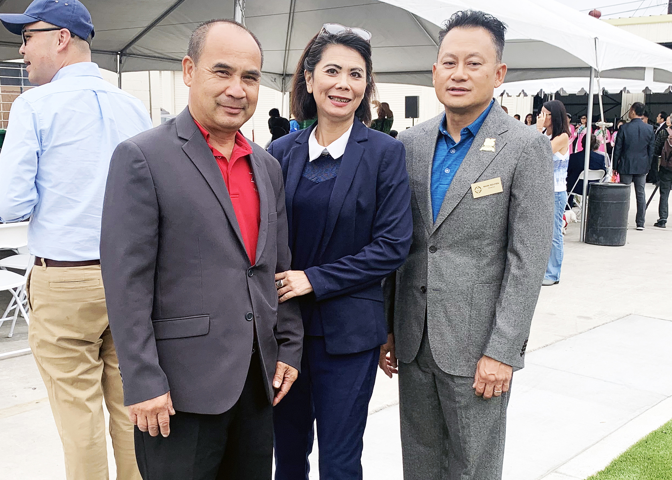 Ông Anh “Andy” Nguyễn (trái) và vợ chụp hình với ông Mark Nguyễn, chủ tịch Hội Đồng Quản Trị Đặc Khu Vệ Sinh Midway City Sanitary District. (Hình: Lâm Hoài Thạch/Người Việt)