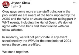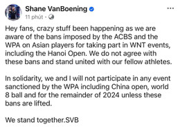 Để thể hiện sự đoàn kết, chúng tôi sẽ không tham dự bất kỳ giải đấu nào được WPA chấp thuận. Trừ khi lệnh cấm được gỡ bỏ, chúng tôi sẽ vắng mặt tại giải Trung Quốc mở rộng, giải 8 bi và những sự kiện còn lại trong năm 2024″, Shane Van Boening chia sẻ.