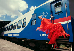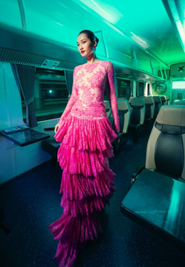 Dàn người mẫu diện những thiết kế ren sặc sỡ trong bộ sưu tập mới của nhà thiết kế (NTK) Vũ Ngọc và Son với bộ ảnh chụp ở ga Sài Gòn.