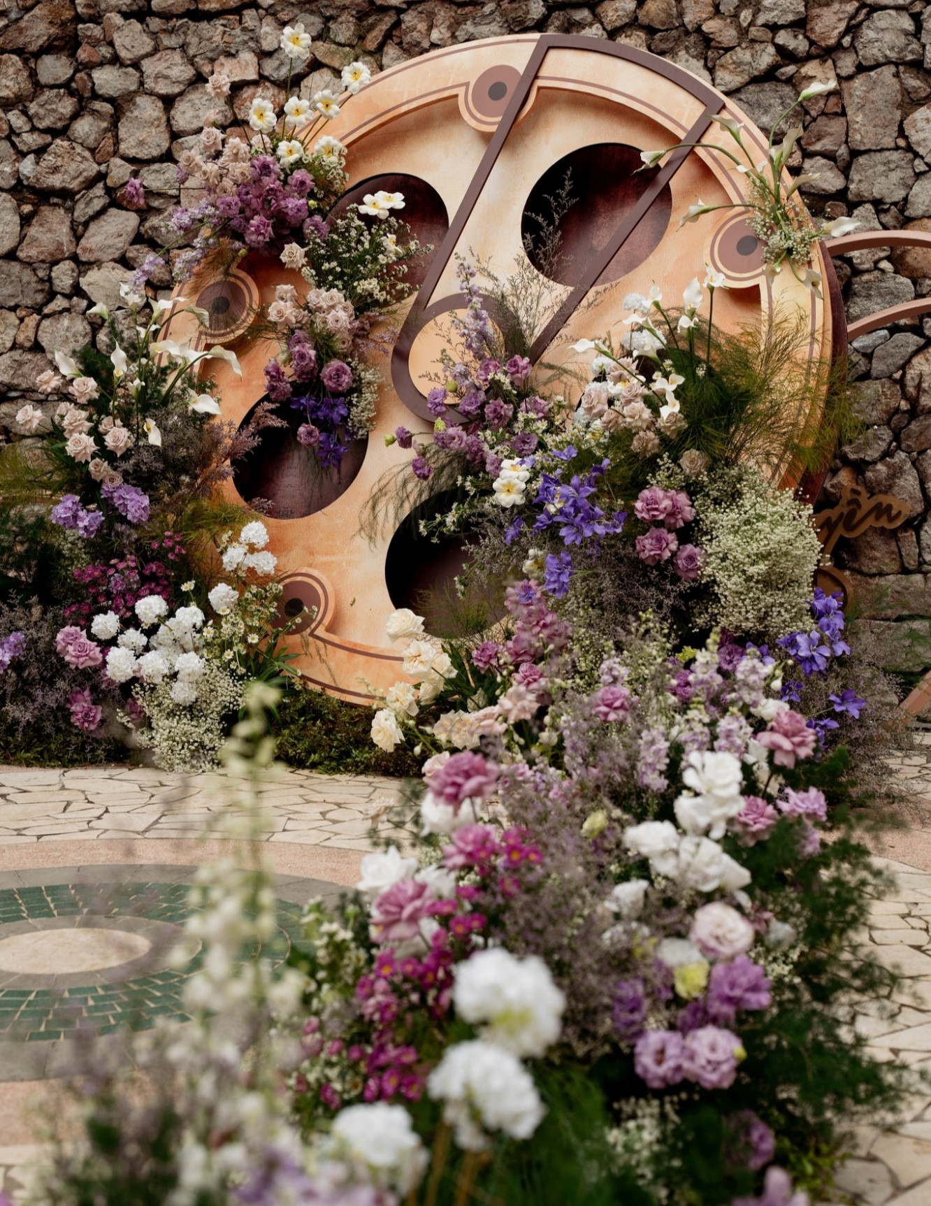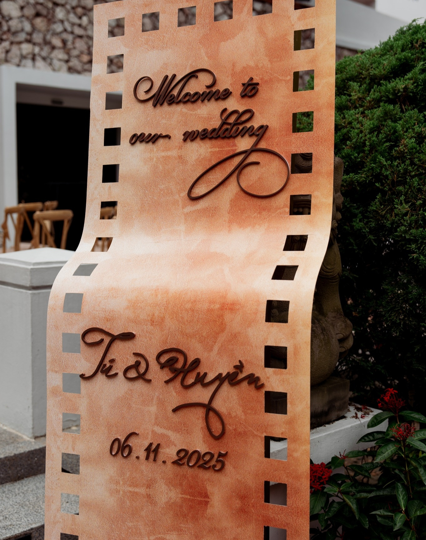 Đến với nhau nhờ phim ảnh và cùng là diễn viên nên cặp đôi chọn decor không gian đám cưới đậm màu sắc điện ảnh với hình ảnh những cuốn phim. Không gian ngoài trời được trang hoàng đơn giản nhưng sang trọng và ấm cúng, đánh dấu khởi đầu hôn nhân của 2 diễn viên hơn nhau 5 tuổi.