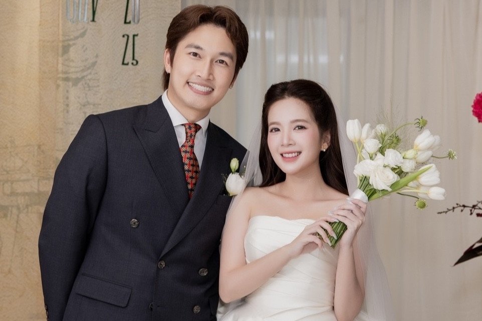 Đình Tú chọn vest trẻ trung màu vàng nâu đồng kết hợp sơ mi phóng khoáng còn cô dâu Ngọc Huyền xinh như công chúa bước ra từ thế giới cổ tích. Ngọc Huyền chọn đầm ngắn hở vai trẻ trung kết hợp giày cao gót 20cm để không quá chênh lệch chiều cao với chồng điển trai. Cặp đôi liên tục nở nụ cười hạnh phúc trước ống kính trong ngày trọng đại.