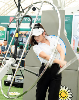 Tại Hội chợ Mùa thu 2025, nữ diễn viên gây chú ý khi xuất hiện với áo trắng cùng giày thể thao, biểu diễn thuần thục các thao tác chơi golf trên khung tập và hướng dẫn cho các khách mời các động tác tập khó, giúp bộ môn quý tộc này trở nên đơn giản hơn trong mắt nhiều người.
