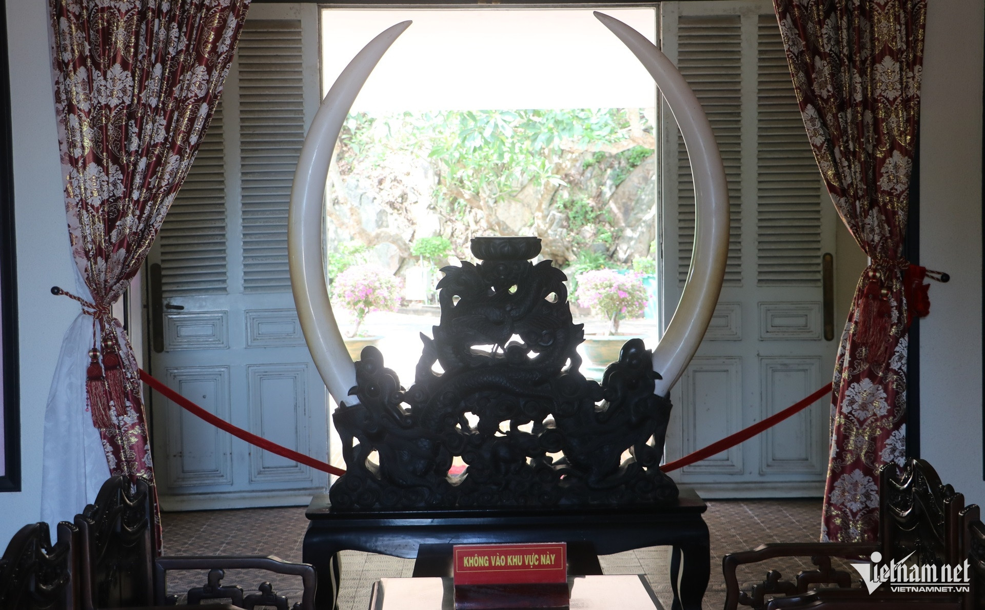 Tầng trệt vừa làm nơi khánh tiết vừa dùng để trưng bày nhiều hiện vật cổ xưa như song bình bách điểu chầu phụng, bộ tràng kỷ hoàng gia có niên đại Khải Định (năm 1921), cặp ngà voi châu Phi dài 170cm. Ảnh trên: Du khách tham quan khu vực tầng trệt tại Bạch Dinh.