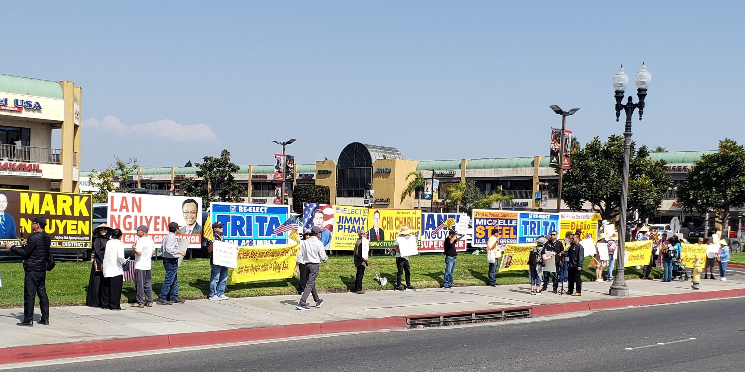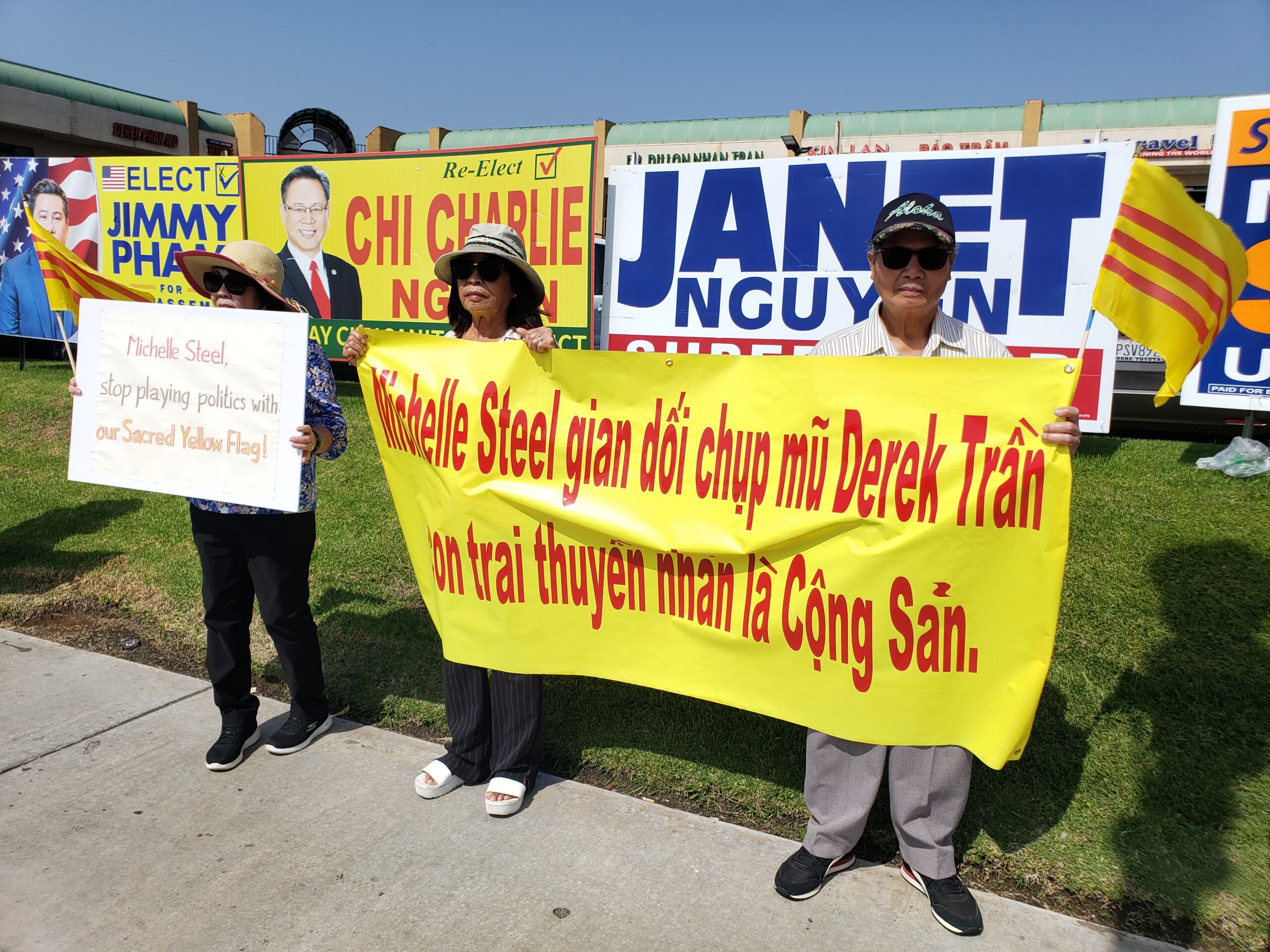 WESTMINSTER, California (NV) – Đông đảo người gốc Việt tổ chức biểu tình phản đối Dân Biểu Michelle Steel (Cộng Hòa-Địa Hạt 45) lạm dụng hình ảnh cờ vàng Việt Nam Cộng Hòa và chụp mũ ông Derek Trần, ứng cử viên dân biểu liên bang của đảng Dân Chủ, là Cộng Sản lúc 1 giờ trưa Thứ Bảy, 5 Tháng Mười, trên đường Bolsa, đối diện thương xá Phước Lộc Thọ, Westminster.