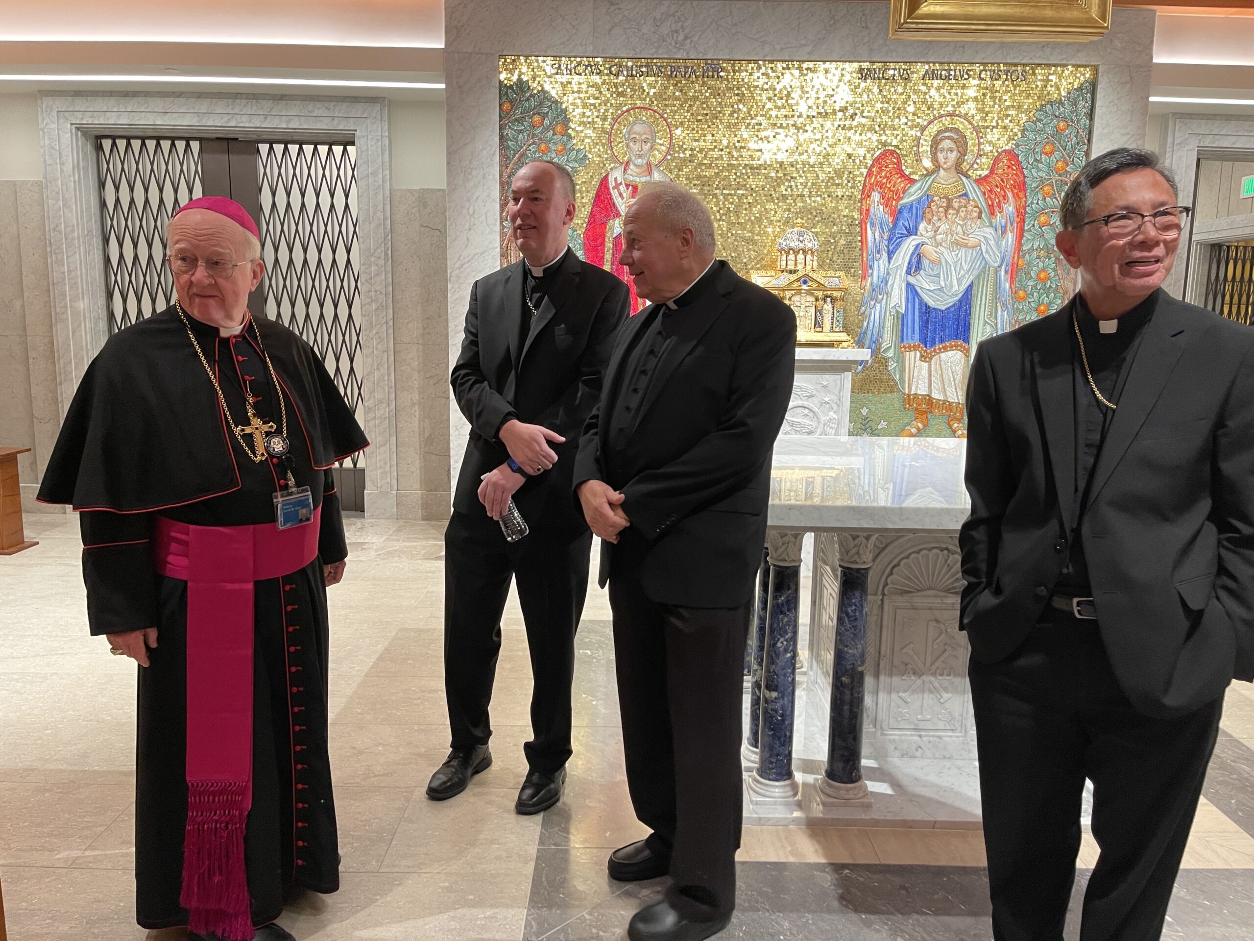 Từ trái, Giám Mục Kevin Vann, Giám Mục Timothy Freyer, Linh Mục Christopher Freyer, và Giám Mục Nguyễn Thái Thành, chuẩn bị họp báo cung hiến nhà nguyện St. Callistus và Hầm Mộ hôm 14 Tháng Mười. (Hình: Đỗ Dzũng/Người Việt)