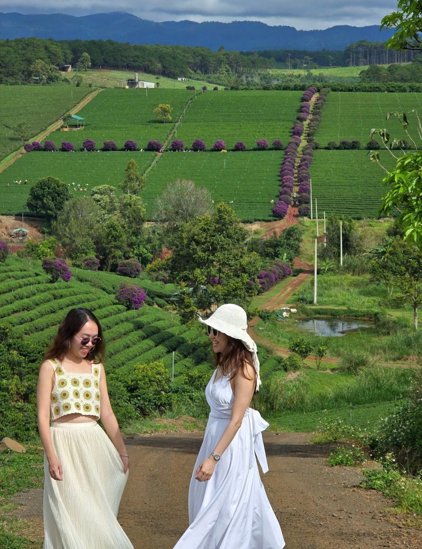 Chị Vy cảm thấy tự hào khi cảnh vật ở nông trường được nhiều người yêu thích. Ngoài hàng mua tím, các bạn trẻ đến đây được chiêm ngưỡng đồi chè Oolong xanh mướt, hít thở không khí trong lành.