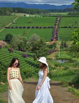 Trên đường đến nông trường, từ xa, chị Ngân đã thấy hàng hoa mua tím len vào giữa màu xanh của đồi chè. Khi được đi giữa hai hàng hoa mua trải dài, chị có cảm giác đang lạc vào thế giới cổ tích.