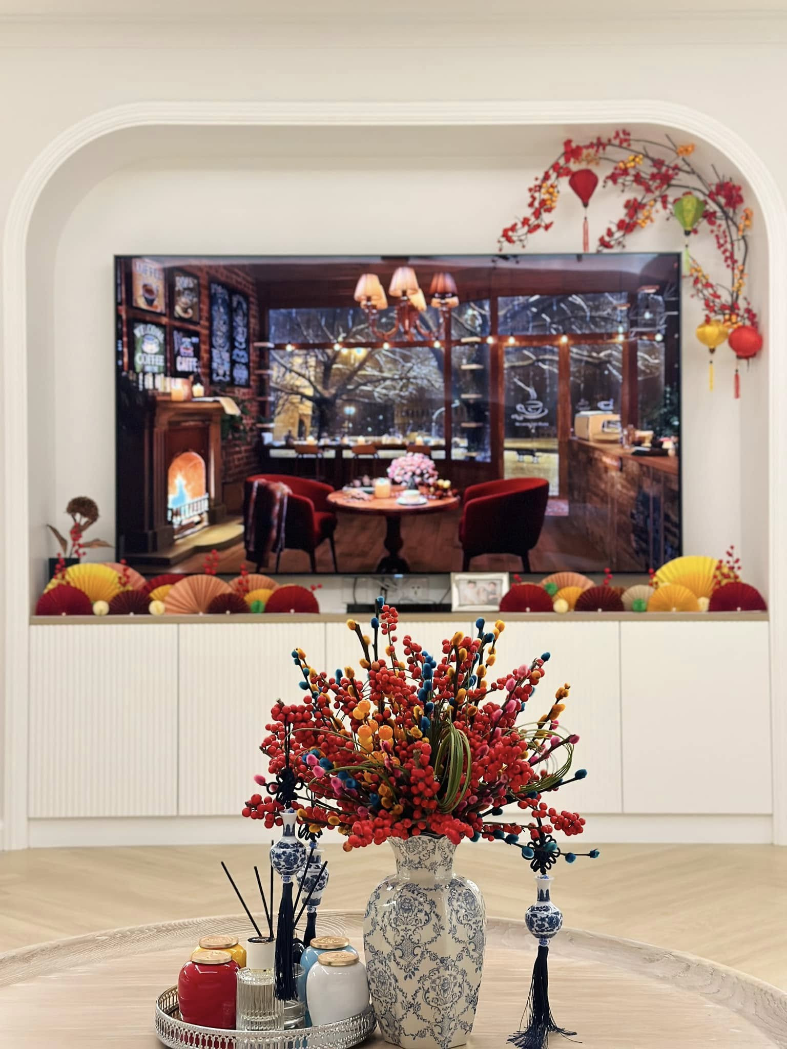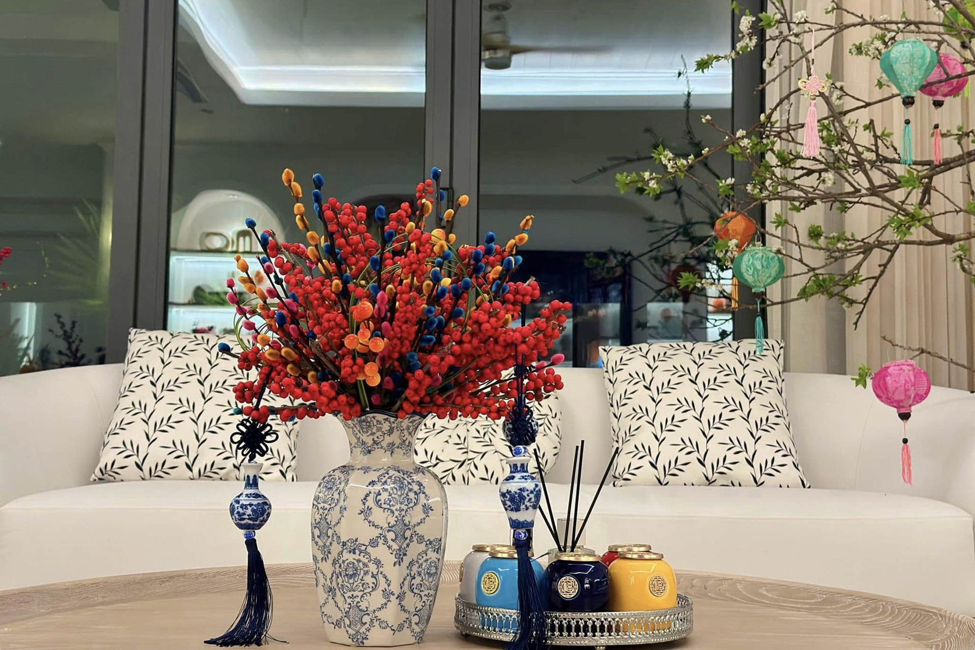 Hoa hậu Đặng Thu Thảo cho biết vừa cho thi công sửa sang, thiết kế lại nội thất. Người đẹp hài lòng khi không gian sống đơn giản mà sang trọng, hài hòa, có nhiều cây, hoa phù hợp với không khí Tết.