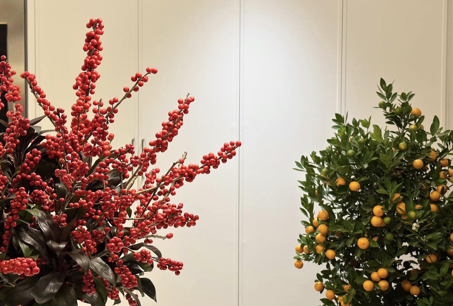 Trên nền màu trắng chủ đạo của căn nhà, các chậu quất, đào, đông đào giả, đèn lồng… đủ màu sắc thêm phần rực rỡ.