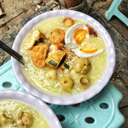 Tô cháo được phục vụ đầy đặn với các nguyên liệu đặc trưng, gồm đậu rán tẩm hành, cà muối và ca la thầu (củ cải ngâm).
