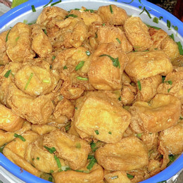 Đậu rán được bà chọn mua từ một quán quen nhiều năm nay. Đậu phải được rán ngập dầu, giữ mức lửa lớn để ngoài giòn, trong mềm, ăn không bị ngán. Sau khi rán, đậu được tẩm với gia vị, hành lá cho thơm, có vị mặn đặc trưng.