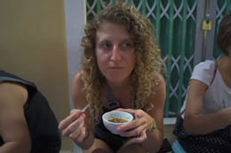 Thông thường, tại các hàng quán, chả rươi được chủ quán rán chín rồi phục vụ thực khách. Nhưng ở quán mà Chris và Steph đến, thực khách sẽ tự rán rươi trên chảo dầu và bếp cồn, chín tới đâu ăn tới đó cùng với bún, rau sống và nước chấm.