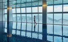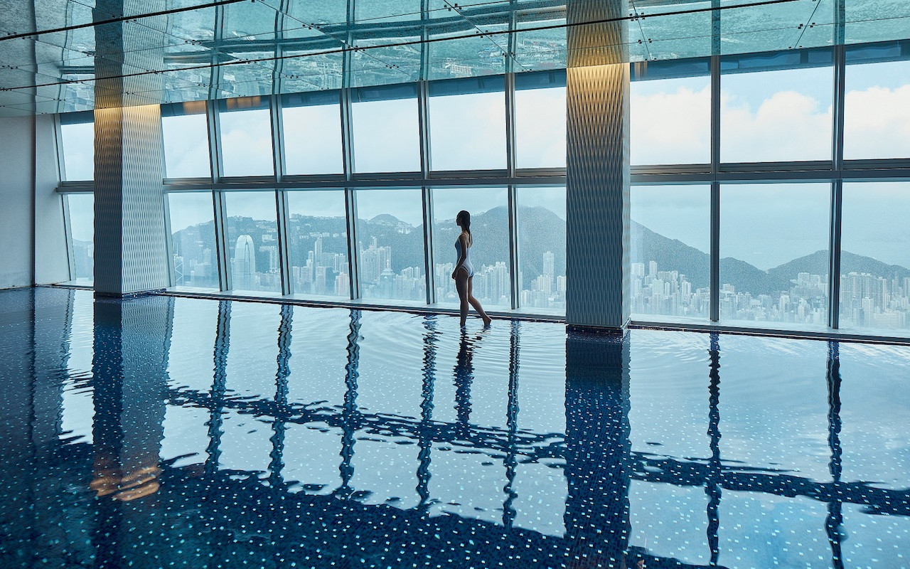 Sau chuyến bay dài 13 tiếng khởi hành từ London (Anh) đến Hong Kong, Harriet tắm rửa để xua tan mệt mỏi rồi lên bể bơi cao nhất thế giới của khách sạn tham quan.