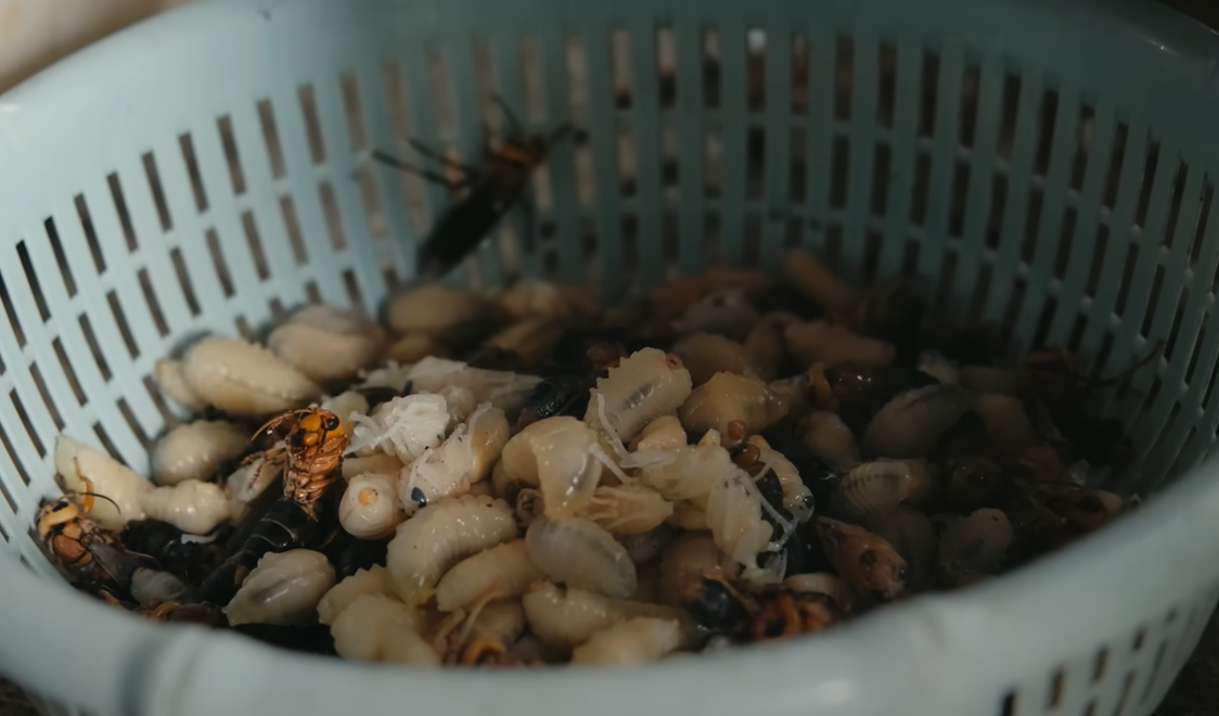 Vị khách Tây tiết lộ, phần nhộng này được thu hoạch từ tổ ong bắp cày “khổng lồ”, nặng khoảng 80-90kg, được người bản địa nuôi, chăm sóc trong hơn 1 năm. Chúng là nguyên liệu chế biến thành nhiều món ăn khác nhau nhưng ngon và phổ biến hơn là nhộng rang lá chanh.