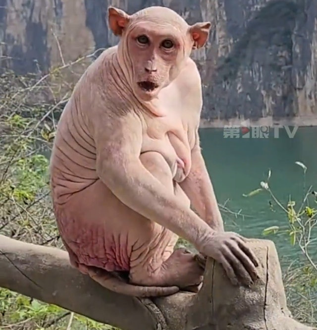Trong đoạn video mới đây được ghi lại tại khu danh thắng Baidi Cheng, Trùng Khánh, nhiều người bất ngờ trước hình ảnh con khỉ với lớp da màu hồng nhạt và không có lấy một cọng lông.