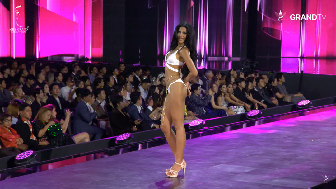 Top 20 Miss Grand International 2024 bước vào phần thi áo tắm với trang phục hai mảnh màu trắng. Trên nền nhạc sôi động, từng thí sinh bước ra trong sự cổ vũ nồng nhiệt từ khán giả.
