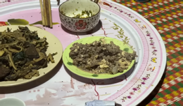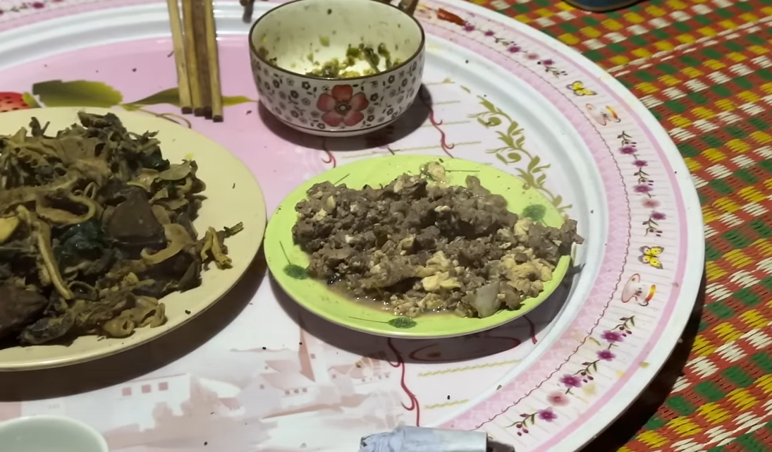Trong bữa ăn hôm ấy ở làng, tôi còn được trải nghiệm 1 số món ăn từ bò như lòng bò xào, lưỡi băm nhỏ nấu cùng não, da bò thui…