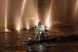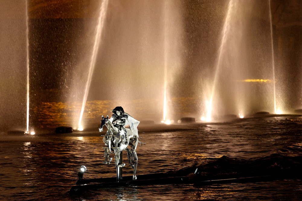 Người đeo mặt nạ cưỡi ngựa máy trên sông, được đặt trên một chiếc tàu ngầm, mang theo lá cờ Olympic, khởi hành từ cầu Austerlitz và kết thúc tại cầu Iena để vào bảo tàng Trocadero.