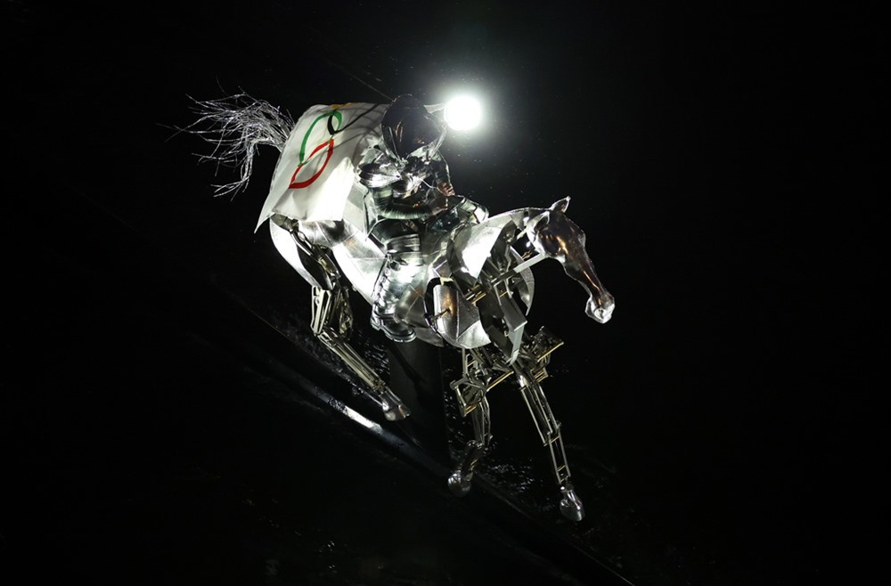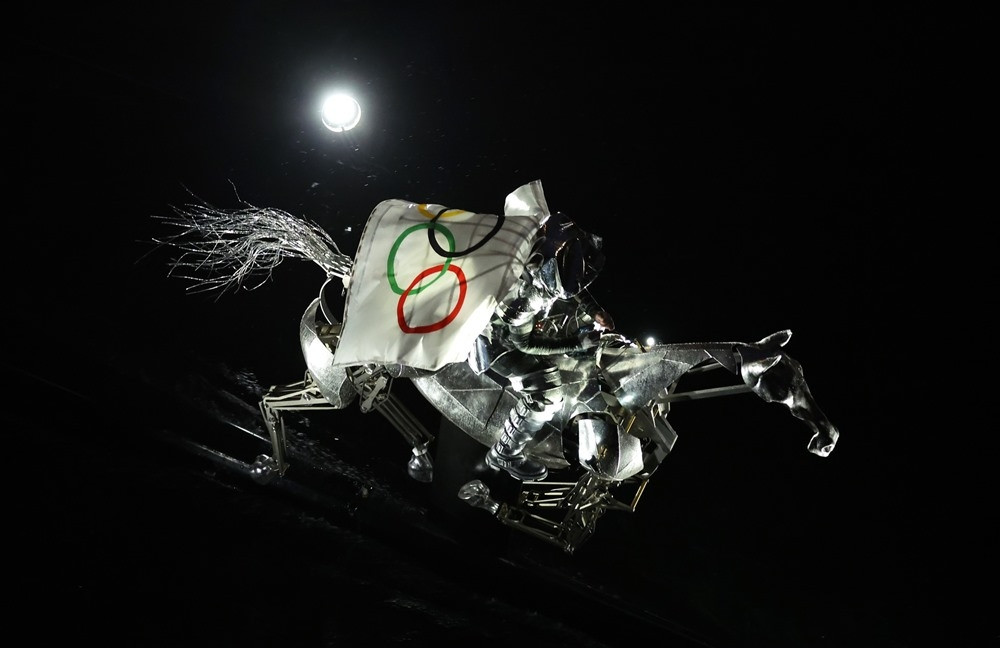 Kỵ sĩ giấu mặt sau khi tới cầu Iena, cưỡi ngựa trắng tiến vào quảng trường Trocadero, mang theo cờ Olympic để làm lễ thượng cờ Thế vận hội.