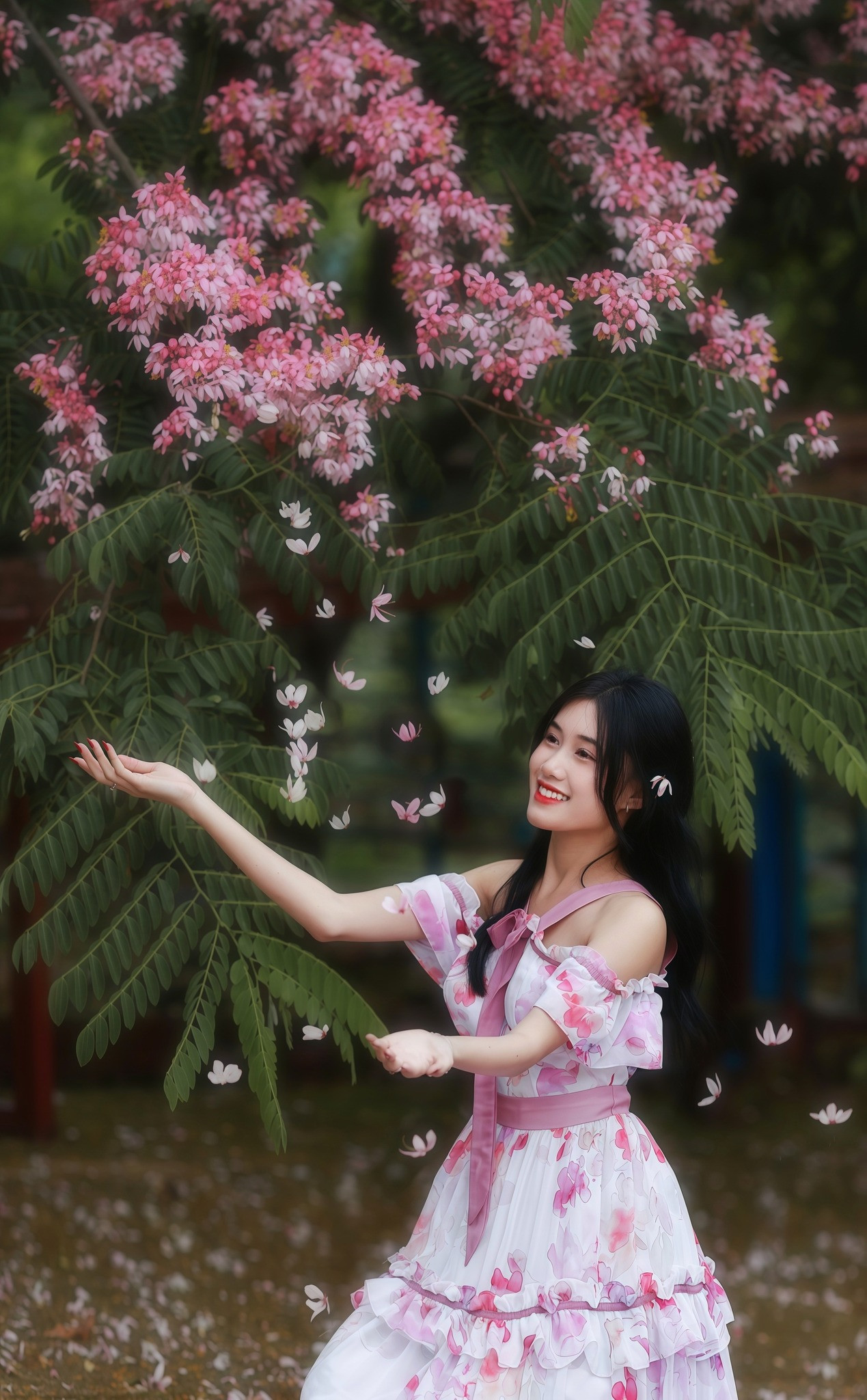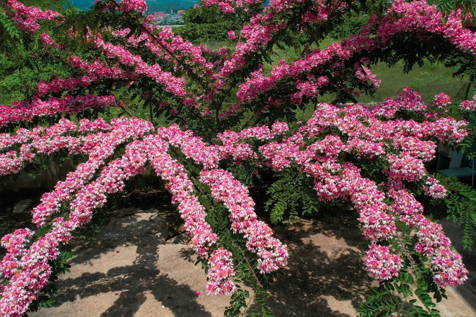 Từ giữa tháng 5, muồng anh đào bắt đầu khoe sắc. Những nhánh cây buông dài, nặng trĩu từng cụm hoa lớn màu trắng – hồng đan xen, nổi bật giữa lớp lá xanh mướt. Hoa thường nở rộ đồng loạt.