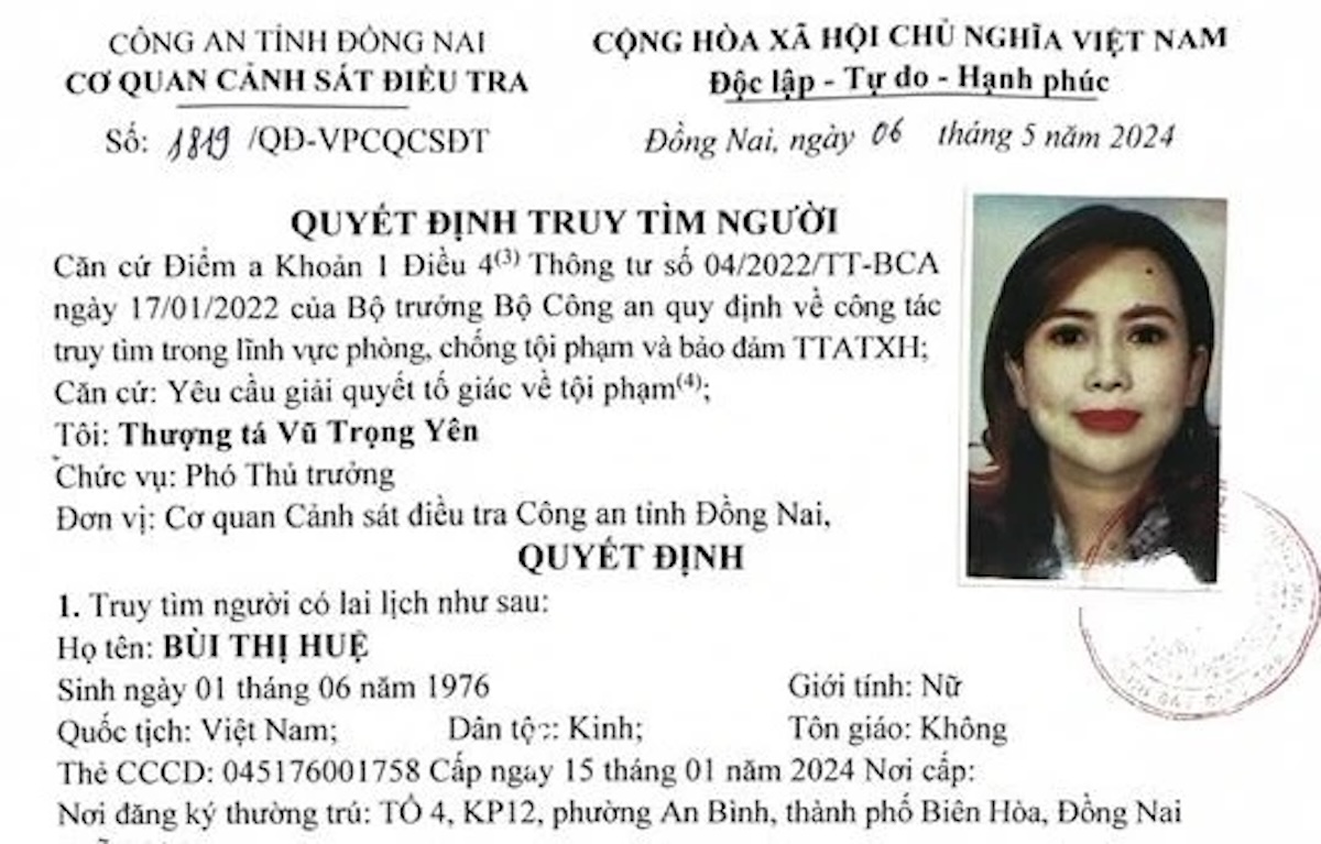 Thông báo “truy tìm” cho thấy bà Huệ làm thẻ căn cước tại thành phố Biên Hòa, tỉnh Đồng Nai, hồi Tháng Giêng, và nhiều khả năng đã bỏ trốn sang Mỹ trước Tháng Năm.