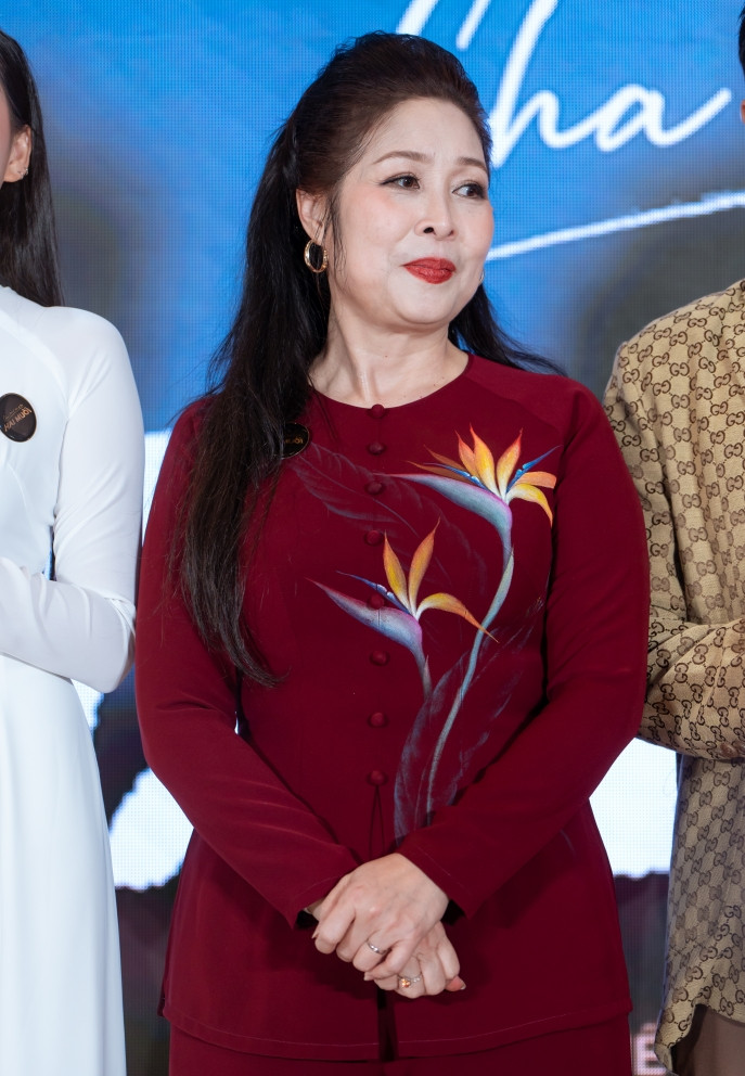 Mẹ ruột của anh từ quê nhà Tiền Giang lên TPHCM ủng hộ con trai. Bà diện trang phục giản dị, cùng con trai, con dâu và hai cháu ngoại bước trên thảm đỏ và tạo dáng trước ống kính.