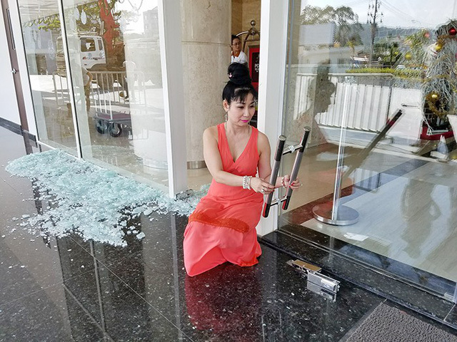 Nữ diễn viên Uyên Thảo vừa bước vào khách sạn, cơn gió lớn ập đến làm nổ tung cánh cửa khiến chị một phen chết đứng.