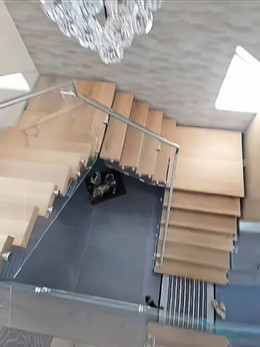 Bên trong nhà được lát sàn đá, cầu thang giữa nhà; tổng quan là không gian mở với nhiều cửa sổ lớn đón nắng biển và trần cao.