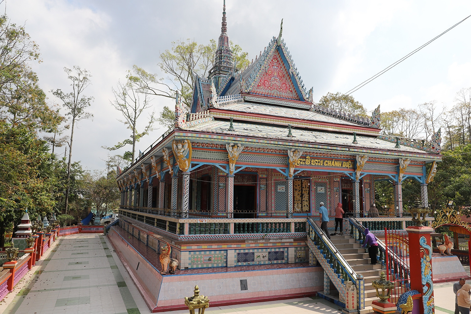 Trước chánh điện, đôi sư tử đá trắng được chạm khắc tinh xảo như đang trấn giữ, chào đón du khách thập phương. Chánh điện rộng lớn, mái ngói trang trí họa tiết hổ phù – một nét đặc trưng của kiến trúc Nhật Bản, tạo nên sự giao thoa văn hóa Đông Á giữa lòng miền Tây Nam Bộ. Hệ thống cửa gỗ được chạm trổ hoa văn tinh tế, làm tăng thêm vẻ cổ kính cho ngôi chùa.