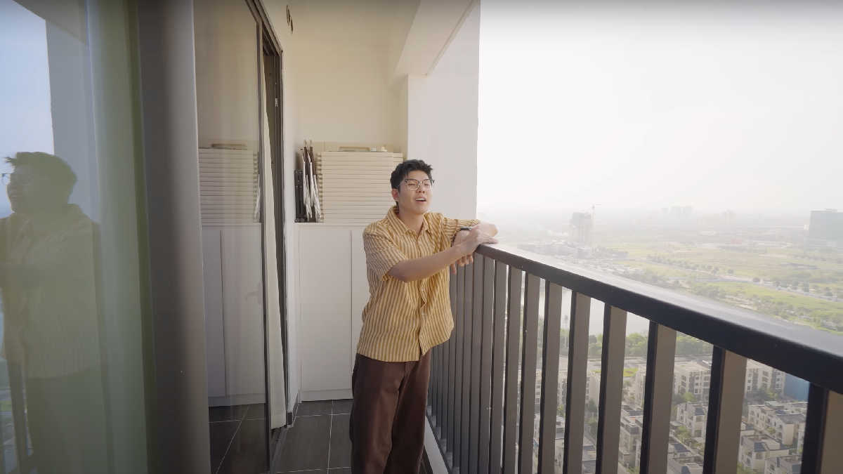 Ban công có tầm nhìn hướng ra Hồ Tây, được thiết kế đa chức năng, vừa là nơi thư giãn, đón nắng gió, vừa có công dụng như nhà kho. Cặp đôi lắp đặt 3 tủ để vừa tối ưu hóa không gian, vừa che đi hệ thống dây, đường nước phía sau.