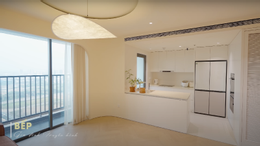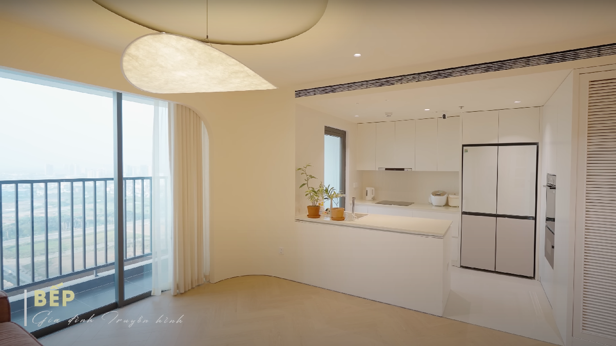 Tủ bếp màu trắng vỏ trứng mang lại cảm giác sạch sẽ, tối giản. Khu vực này được trang bị nhiều thiết bị hiện đại nhưng dễ sử dụng đối với người giúp việc, các thành viên lớn tuổi trong gia đình.