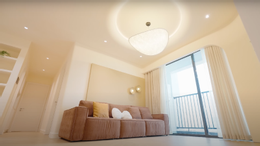 BTV Mạnh Cường tự hào về ý tưởng trần nhà với thiết kế vách cong kết hợp đường dây đèn LED, giúp không gian phòng khách cao, thoáng hơn. Hệ thống đèn thả được trang bị công nghệ điều khiển bằng giọng nói.