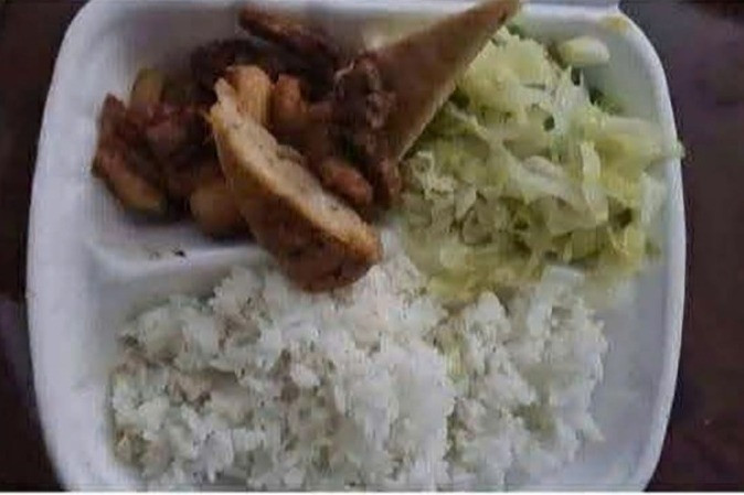 Tuy nhiên, khi dọn lên bàn, mâm chỉ có vỏn vẹn 5 món cho 9 người gồm: rau xào, đậu sốt cà chua, thịt kho trứng cút, tôm rang và cà muối.