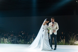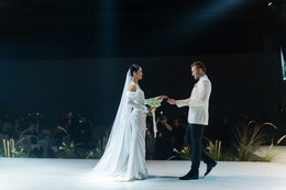Sau lễ rước dâu tại nhà gái và đón dâu về nhà trai, lễ cưới của cặp đôi được tổ chức tại một trung tâm hội nghị ở Hưng Yên, với sự tham gia của hơn 1000 khách mời.