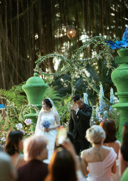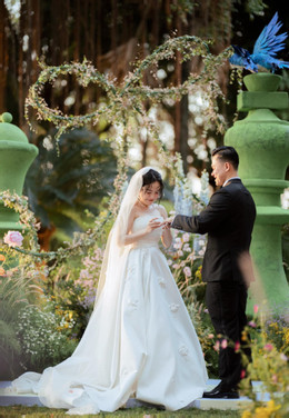 Ngày 7/12, ca sĩ Thái Trinh và chồng kém 6 tuổi tổ chức tiệc cưới tại khu nghỉ dưỡng ngoại ô TPHCM. Không gian buổi lễ được thiết kế như khu vườn cổ tích, lấy cảm hứng từ sở thích chung: chơi cờ vua, với hình tượng quân vua và hậu đại diện cô dâu, chú rể. Cặp đôi xúc động rơi nước mắt, trao nhau những lời tình cảm ngọt ngào.