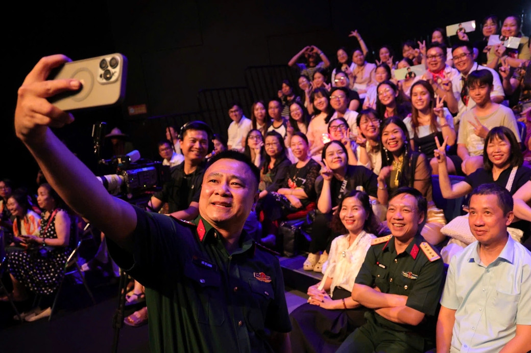NSND Tự Long cùng đoàn phim “Hộ linh tráng sĩ” mặc cổ phục diễu hành dưới trời nắng gắt trong khuôn khổ sự kiện Triển lãm thành tựu Đất nước diễn ra tại Trung tâm Hội chợ triển lãm Quốc gia sáng 28/8.