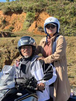 Từ năm 2022, ông Cẩm (TPHCM) khuyên vợ nghỉ việc buôn bán để đi du lịch khắp nơi. Ông đã lái xe máy đưa bà đi hàng chục tỉnh, thành, bù đắp những năm tháng thanh xuân bộn bề vất vả, lo lắng cho gia đình.
