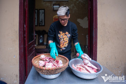 8-9h30 là thời điểm khách ra vào nườm nượp. Mấy dãy bàn trong ngõ đều kín chỗ, cứ khách này đứng lên sẽ có khách khác thay thế. Anh Thành và một nhân viên khác thay nhau thái thịt.