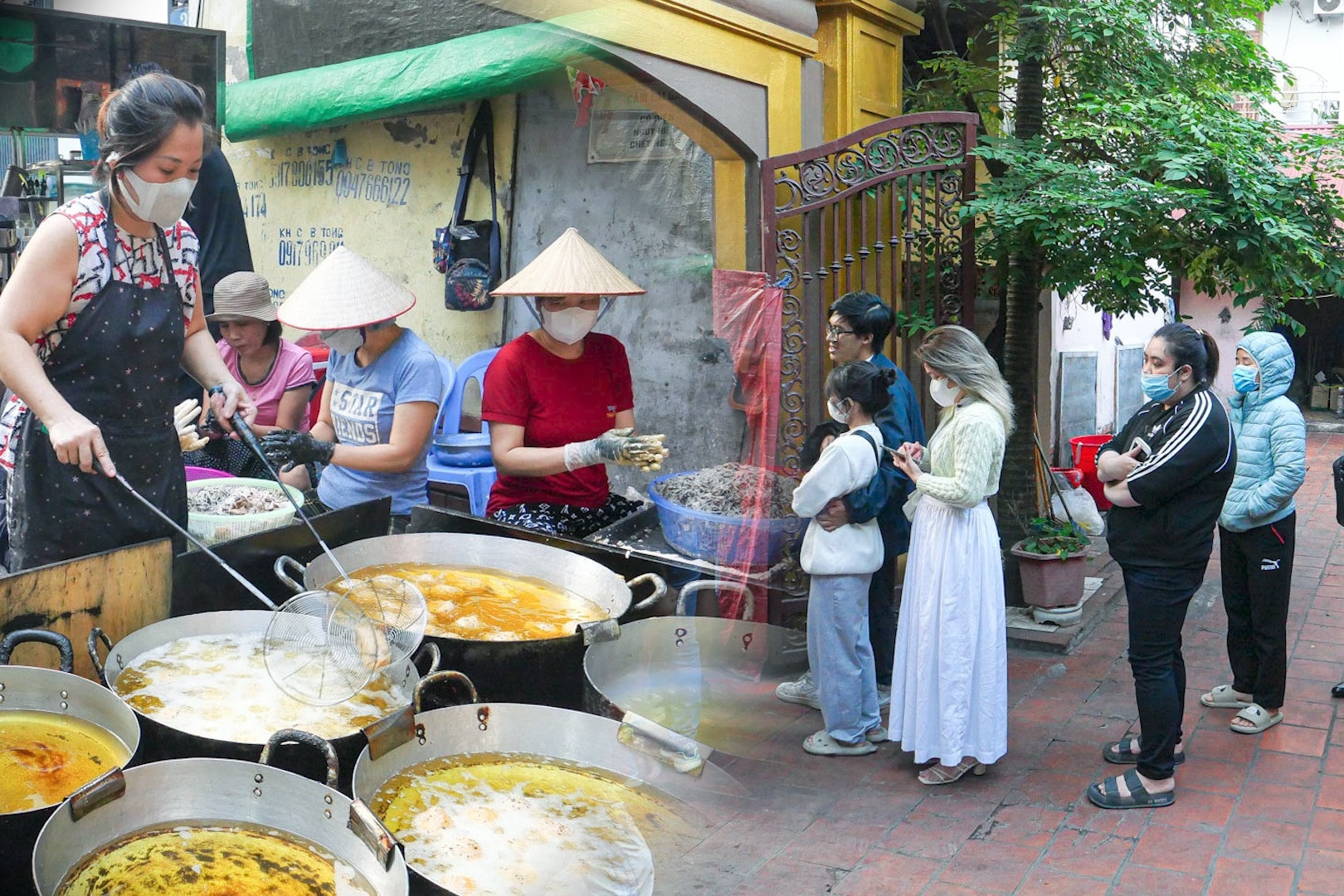 Những chiếc bánh sau khi nặn sẽ được rán lần lượt qua 3 chảo dầu lớn, ở nhiệt độ tăng dần đến khi vỏ bánh vàng ruộm, giòn rụm. Theo chủ quán, công đoạn rán bánh là khó nhất vì cần điều chỉnh nhiệt độ phù hợp.